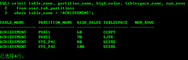 这时会发现,第三条和第四条数据虽然没有建立对应的分区,但是也插入到了表中。此时查看数据字典USER_TAB_PARTITIONS,如下: