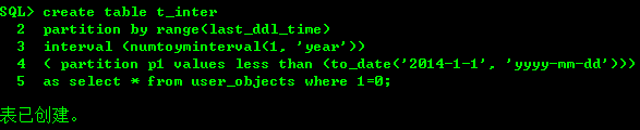 接下来,创建一个分区键类型为DATE型的间隔分区表T_INTER,如下: