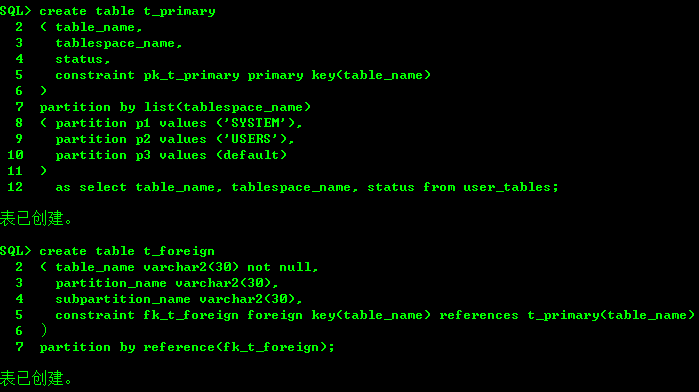 例如,创建两个参考分区表T_PRIMARY和T_FOREIGN,如下: