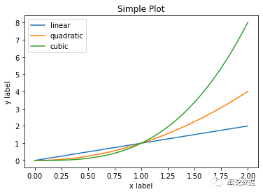 import numpy as npimport pandas as pdimport matplotlib.pyplot as pltx = np.linspace(0, 2, 100)plt.plot(x, x, label='linear') # Plot some data on the (implicit) axes.plt.plot(x, x**2, label='quadratic') # etc.plt.plot(x, x**3, label='cubic')plt.xlabel('x label')plt.ylabel('y label')plt.title("Simple Plot")plt.legend()plt.show()