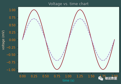 import matplotlib.pyplot as pltimport numpy as npt = np.linspace(0.0, 2.0, 201)s = np.sin(2 * np.pi * t)# 1) RGB tuple:fig, ax = plt.subplots(facecolor=(.18, .31, .31))# 2) hex string:ax.set_facecolor('#eafff5')# 3) gray level string:ax.set_title('Voltage vs. time chart', color='0.7')# 4) single letter color stringax.set_xlabel('time (s)', color='c')# 5) a named color:ax.set_ylabel('voltage (mV)', color='peachpuff')# 6) a named xkcd color:ax.plot(t, s, 'xkcd:crimson')# 7) Cn notation:ax.plot(t, .7*s, color='C4', linestyle='--')# 8) tab notation:ax.tick_params(labelcolor='tab:orange')plt.show()
