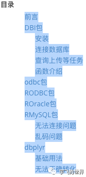 install.packages('DBI')连接数据库