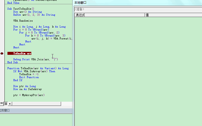 Public Declare Sub CopyMemory Lib "kernel32" Alias "RtlMoveMemory" (ByVal Destination As Long, ByVal Source As Long, ByVal Length As Long)Private Type SafeArrayBoundcElements As Long '// 该维的长度lLbound As Long ' 该维的数组存取的下限,一般为0End TypePrivate Type SafeArraycDims As Integer ' 数组的维度fFeatures As Integer 'cbElements As Long ' / 数组元素的字节大小cLocksas As Long 'pvDataas As Long ' // 数组的数据指针rgsabound() As SafeArrayBoundEnd TypeSub TestToOneDim()Dim arr() As StringReDim arr(1, 2, 3) As StringVBA.RandomizeDim i As Long, j As Long, k As LongFor i = 0 To UBound(arr)For j = 0 To UBound(arr, 2)For k = 0 To UBound(arr, 3)arr(i, j, k) = VBA.Format(i, "x0") & VBA.Format(j, "\y0") & VBA.Format(j, "z0=") & VBA.Format(VBA.Rnd() * 100, "0")NextNextNextToOneDim arrDebug.Print VBA.Join(arr, "|")End SubFunction ToOneDim(arr As Variant) As LongIf Not VBA.IsArray(arr) ThenToOneDim = -1Exit FunctionEnd IfDim ptr As LongDim sa As SafeArrayptr = MyArrayPtr(arr)'获取SafeArrayBound之前的数据CopyMemory VarPtr(sa.cDims), ptr, 16If sa.cDims = 1 Then Exit FunctionReDim sa.rgsabound(sa.cDims - 1) As SafeArrayBound'根据维度再读取需要的数据CopyMemory VarPtr(sa.rgsabound(0).cElements), ptr + 16, sa.cDims * 8'修改为一维'修改rgsabound(0)的个数Dim i As LongFor i = 1 To sa.cDims - 1sa.rgsabound(0).cElements = sa.rgsabound(0).cElements * sa.rgsabound(i).cElementsNextsa.cDims = 1'反写到数组CopyMemory ptr, VarPtr(sa), 16CopyMemory ptr + 16, VarPtr(sa.rgsabound(0).cElements), 8End FunctionFunction MyArrayPtr(ByRef v As Variant) As LongDim b(16 - 1) As ByteCopyMemory VarPtr(b(0)), VarPtr(v), 16' Printf "b = 0x% x", bDim ptr As LongCopyMemory VarPtr(ptr), VarPtr(b(8)), 4' - 0x20 8-11存的是数组地址' - 0x60 8-11存的是数组地址的地址If b(1) = &H60 ThenCopyMemory VarPtr(ptr), ptr, 4End IfMyArrayPtr = ptrEnd Function