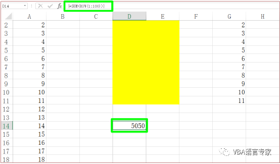 在工作表的任意一个单元格中输入“=sum(Row(1:100))”,然后按Ctrl+Shift+Enter 组合键,你会惊喜的发现,我们要的结果出现了。