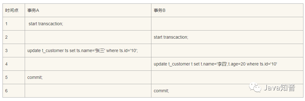 假如原来t_customer表内id为10的行,是一条{id:10,name:"王五",age:15} 的数据,经过事务A修改后变成{id:10,name:"张三",age:15}。事务B提交后,该数据变成了{id:10,name:"李四",age:20}。由事务A所执行的操作在事务B的提交后,数据被冲掉了。这个现象就叫做丢失更新。