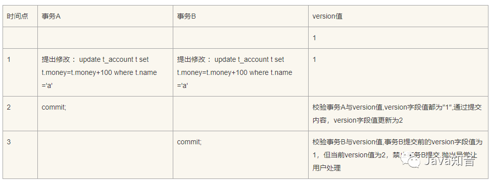 校验事务B与version值,事务B提交前的version字段值为1,但当前version值为2,禁止事务B提交.抛出异常让用户处理