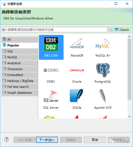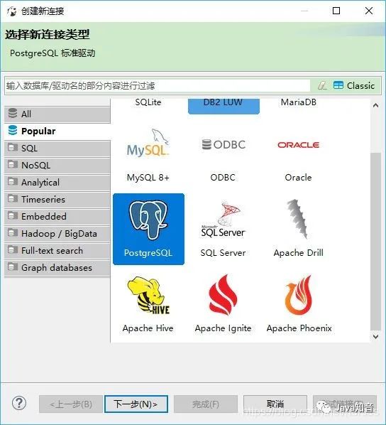 我们以 PostgreSQL 为例,新建一个数据库连接。选择 PostgreSQL 图标,点击“下一步(N)”。