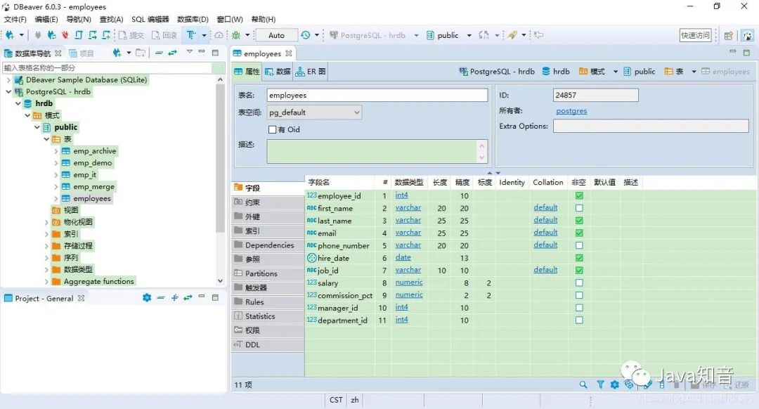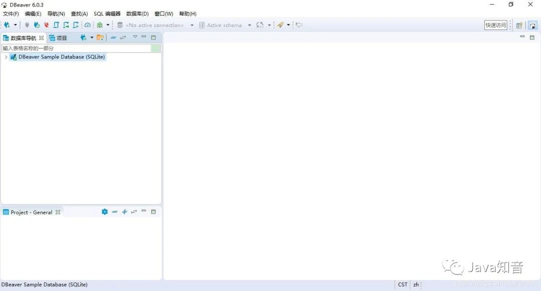 DBeaver 和我们常用的软件类似,最上面是菜单项和快捷工具,左侧是已经建立的数据库连接和项目信息,右侧是主要的工作区域。