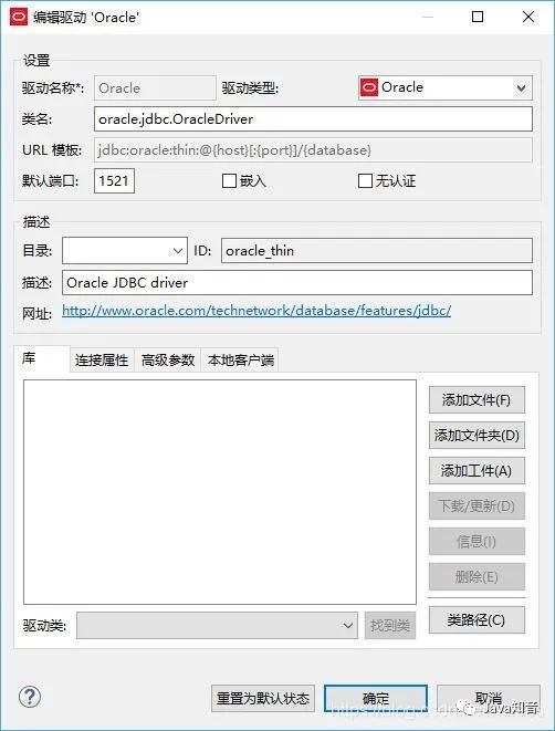 通过界面提示的网址,手动下载 Oracle 数据库的 JDBC 驱动文件,例如 ojdbc8.jar。然后点击“添加文件(F)”按钮,选择并添加该文件。