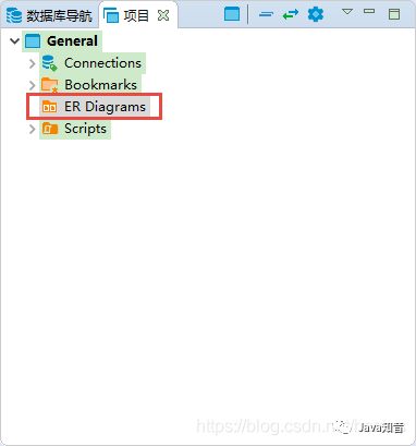 最后介绍一下如何生成数据库对象的 ER 图。点击窗口左侧“数据库导航”旁边的“项目”视图。