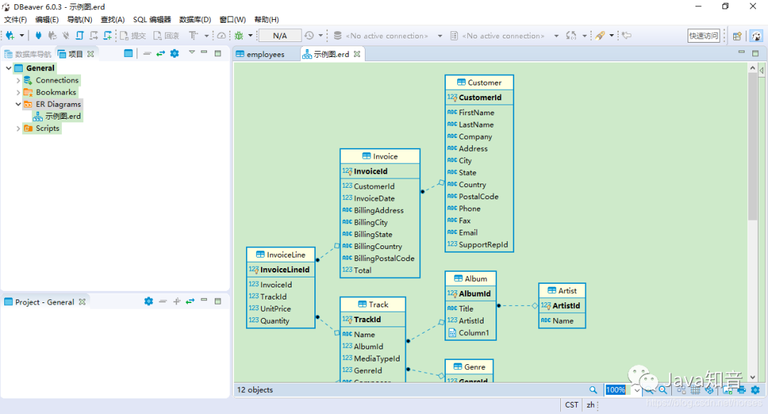 ER 图可以进行排版和显示设置,也支持打印为图片。DBeaver 目前还不支持自己创建 ER 图,只能从现有的数据库中生成。