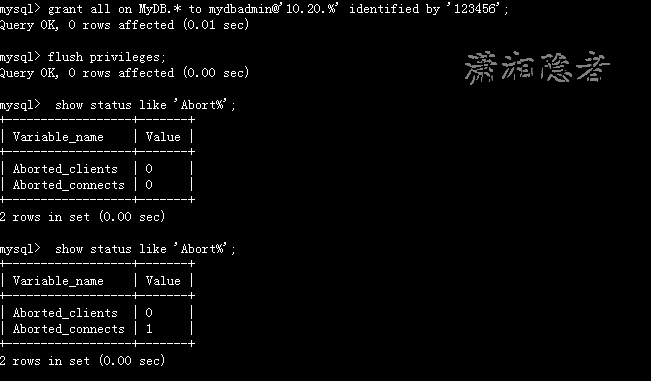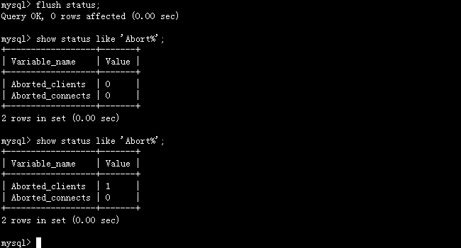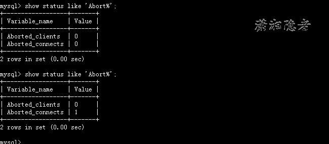你检查状态变量Aborted_connects就会发现状态变量Aborted_connects变为2了。