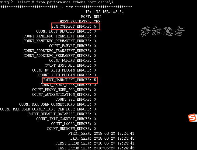 那么如何区分状态变量Aborted Connect是那个引起的呢? 单从状态变量本身是无法区分的,但是可以结合performance_schema.host_cache来稍微做判别、甄别。