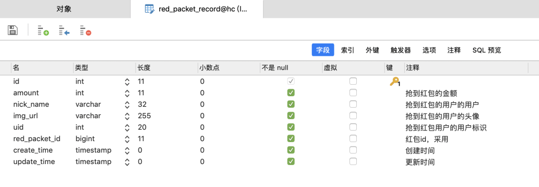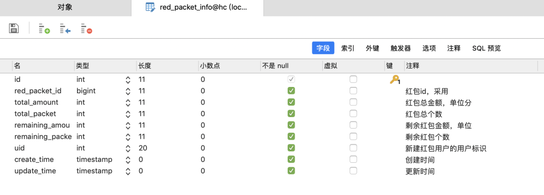) ENGINE=InnoDB AUTO_INCREMENT=1 DEFAULT CHARSET=utf8mb4 COMMENT='抢红包记
