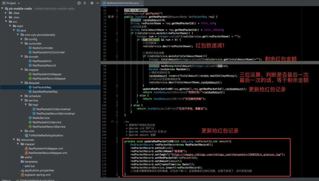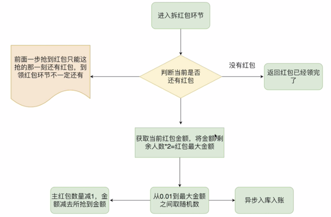 请求 Redis ,当剩余红包个数大于 0,红包个数原子递减,随机获取红包 计算金额,当最后一个红包时,最后一个红包金额=总金额-总已抢红包金额 更新数据库