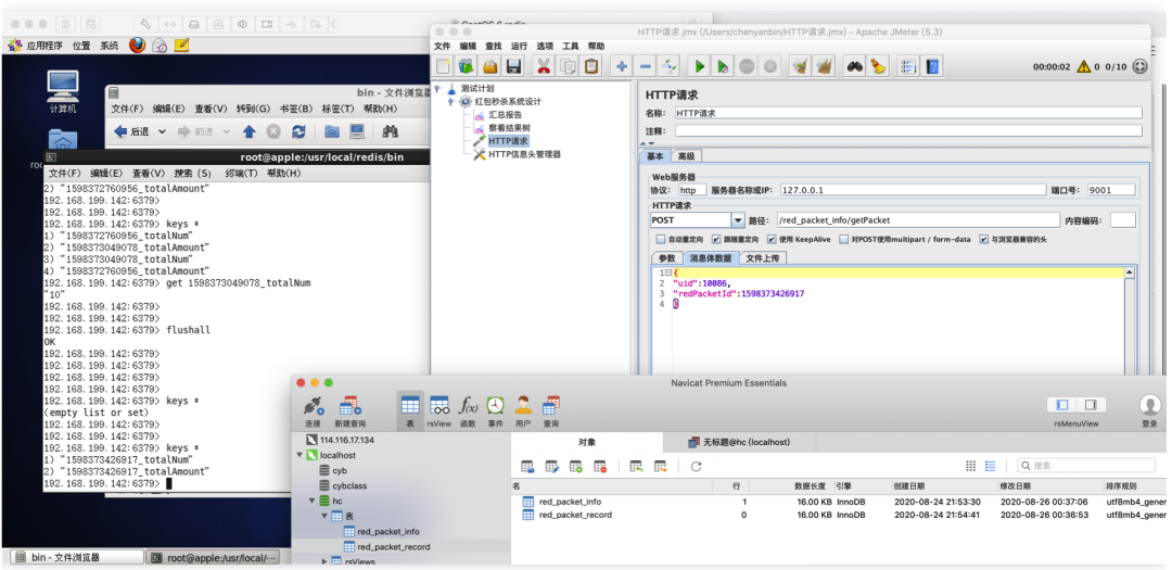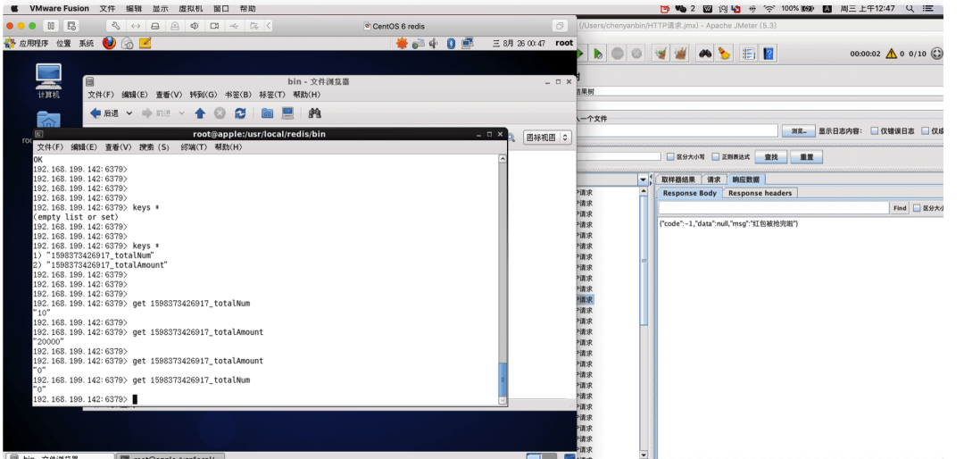 因为我发了 10 个红包,金额是 20000,使用压测工具,模拟50个请求,只允许前10个请求能抢到红包,并且金额等于20000。