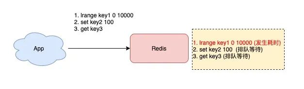 除此之外,我们都知道,Redis 是单线程处理客户端请求的,如果你经常使用以上命令,那么当 Redis 处理客户端请求时,一旦前面某个命令发生耗时,就会导致后面的请求发生排队,对于客户端来说,响应延迟也会变长。