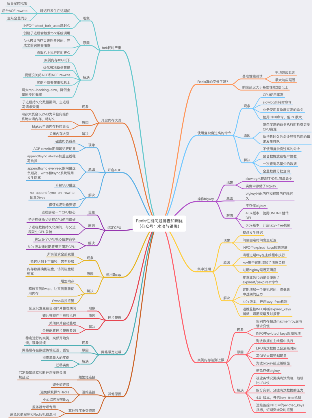 这里我也汇总成了思维导图,方便你在排查 Redis 性能问题时,快速地去分析和定位。