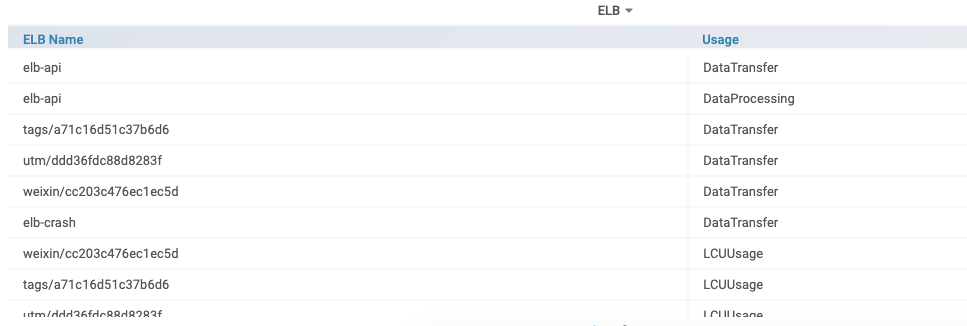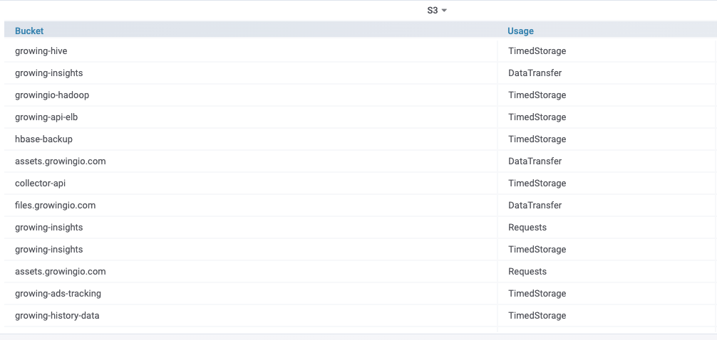 下面是部分的展示图表,分别展示了 S3 的各 Bucket,各应用服务,各 ELB 的费用等部分信息(费用列由于比较敏感,已被隐藏)。