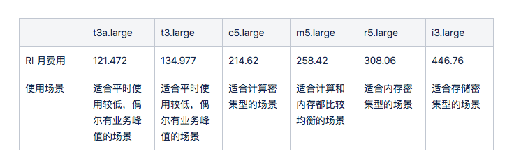 通过机型的价格对比(如 m3,m5 和 t3)和监控中的资源使用情况计算,得出实例可使用的机型,并且给出对应的费用情况。