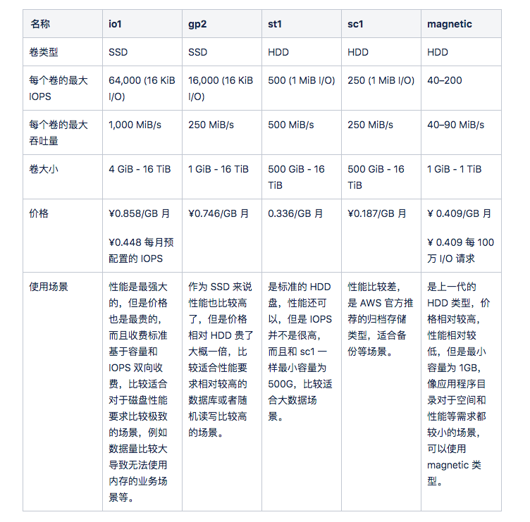 我们在来看一下 AWS 的 EBS 类型和性能,以下部分引用官方数据。