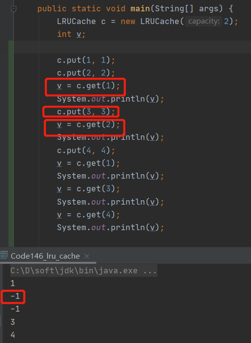 当put(4,1)时,key=1被淘汰,因此get(1)返回-1.