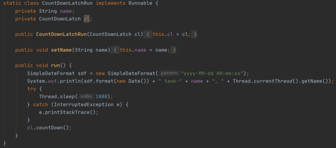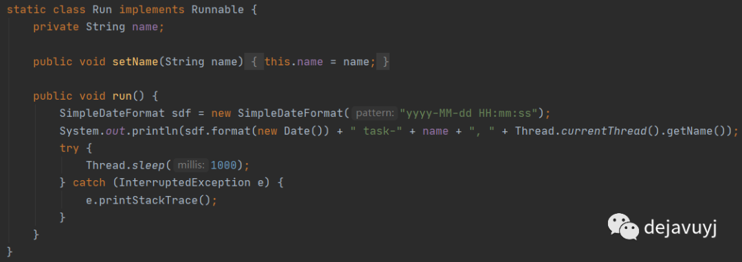我们先写一个简单的Run类.它只打印当前时间,task名称和当前线程名称,然后sleep 1秒后退出.