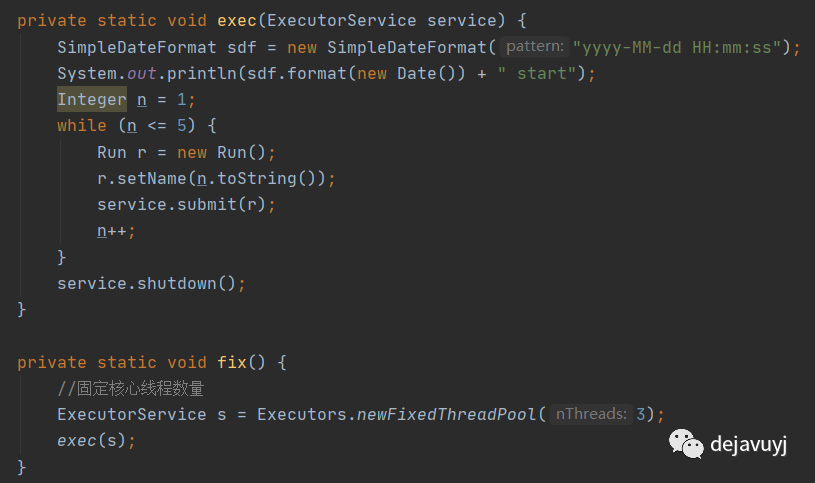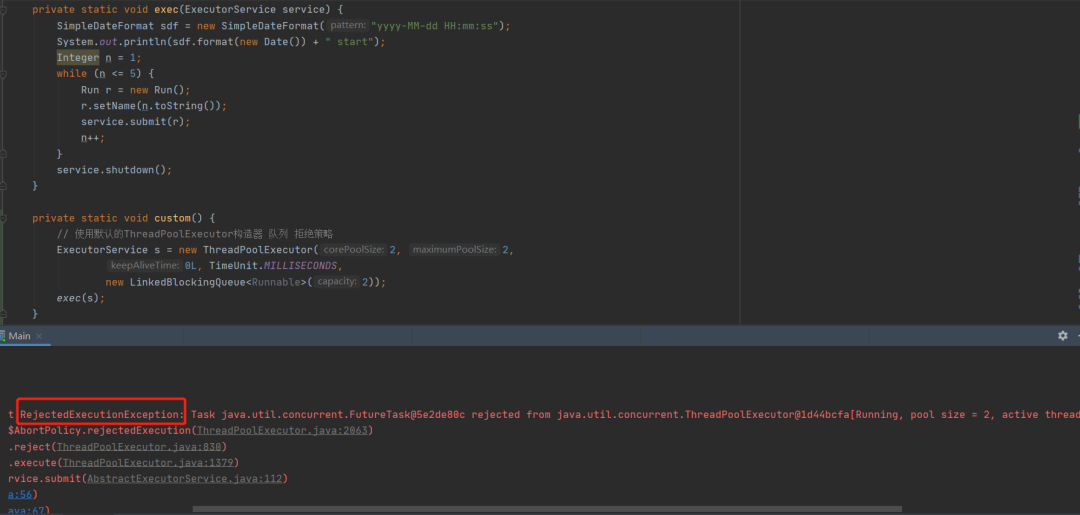 然后写一个简单的exec方法,传入指定类型的线程池,对这个线程池做5次submit.