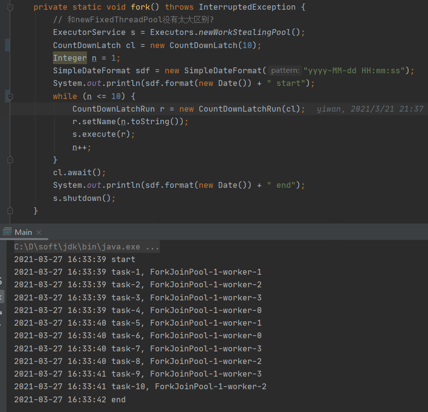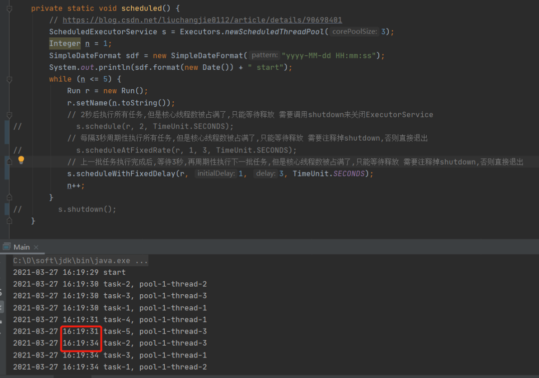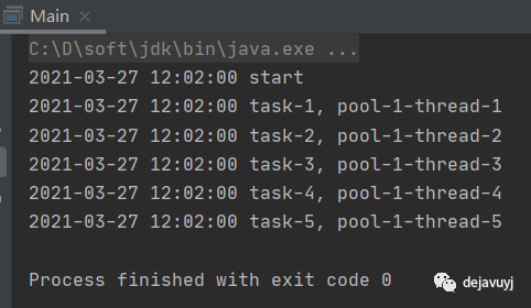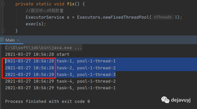 由于这里指定的nThread是3,因此理论上会先打印3行,然后等1秒后,这3个任务结束后,再打印2行.