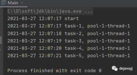每隔一秒,执行一个task,全部都是被thread-1执行.