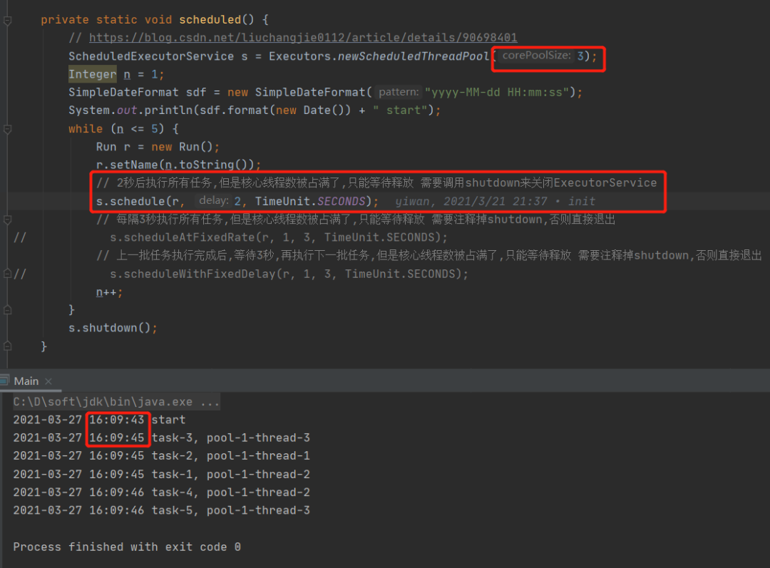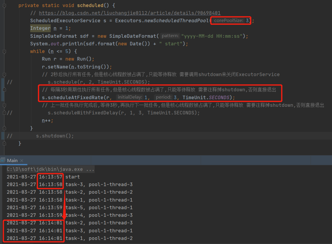 schedule方法是在指定时间间隔后执行所有任务,但是也会收到corePoolSize的限制,示例如下: