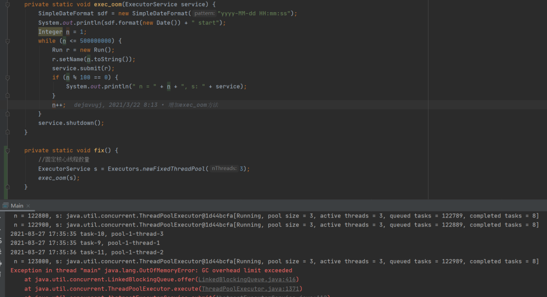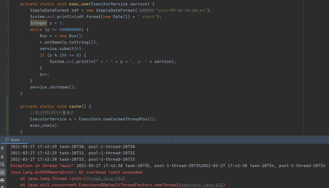 使用-Xmx20m,把最大堆内存设置为20m,然后submit大量线程,就会出现OOM