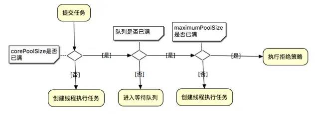 当在execute(Runnable)方法中提交新任务并且少于corePoolSize线程正在运行时,即使其他工作线程处于空闲状态,也会创建一个新线程来处理该请求。 如果有多于corePoolSize但小于maximumPoolSize线程正在运行,则仅当队列已满时才会创建新线程。