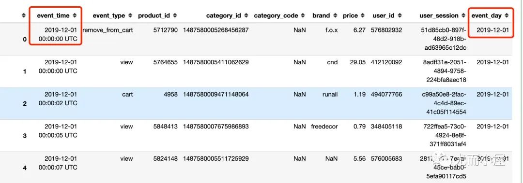 本文中使用的一份数据集是从kaggle下载,主要是包含事件发生时间、类型(阅览、加购、移除购物车和购买)、产品ID、分类ID、产品编码、品牌、价格、用户ID、用户会话,总共7个属性