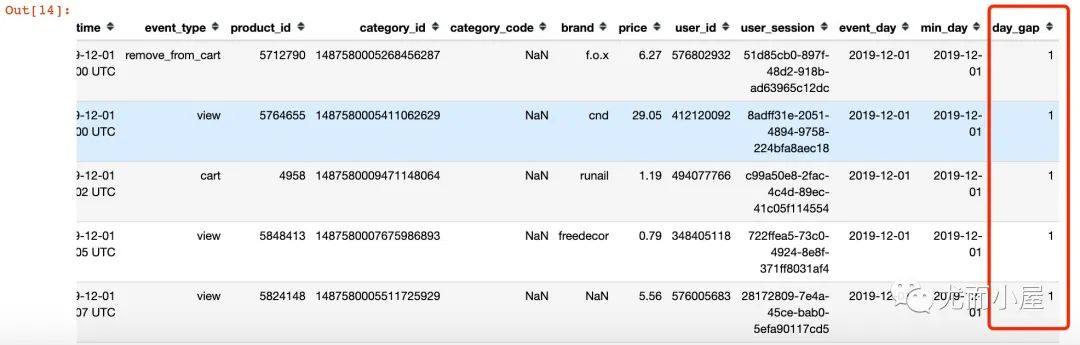 计算每个用户的首次访问时间min_day 记录后续每次访问时间和首次访问时间的间隔day_gap 因为是12月份的电商数据,我们将一个月分成10份,时间周期为3天