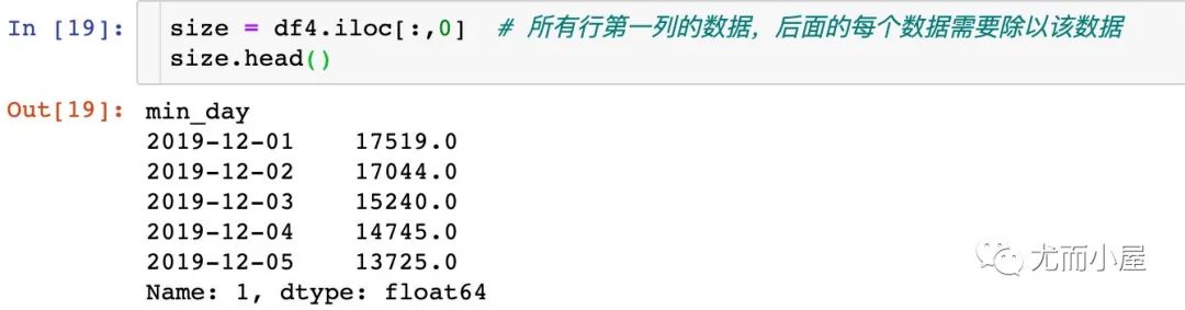 一般情况下,我们习惯用百分比来表示用户的留存,很清晰地看到用户的留存比例。首先我们取出第一列的数据(全部行):