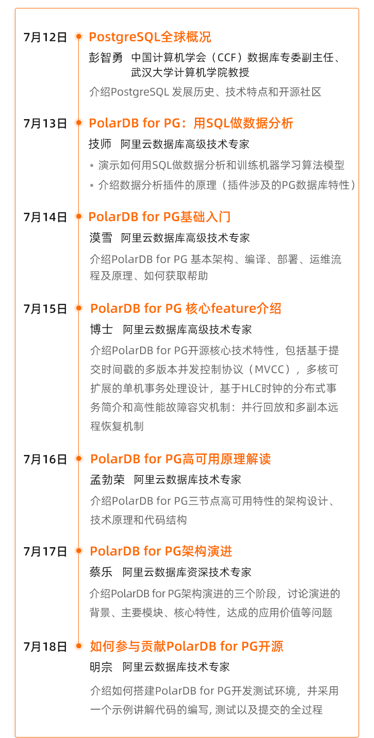 为了帮助开发者迅速了解和熟悉这款分布式云原生数据库,培养首批用户和开源社区贡献者,阿里云联合PG中文社区、白玉兰开源共同打造“七天玩转PolarDB for PostgreSQL开源创造营”,特别邀请中国计算机学会(CCF)数据库专委副主任、武汉大学计算机学院彭智勇教授为你解读数据库领域前沿趋势,还有PG社区资深专家、阿里云数据库技术大咖联合授课,从理论讲解到手把手实战演练,提升个人代码质量,探索职业突破!
