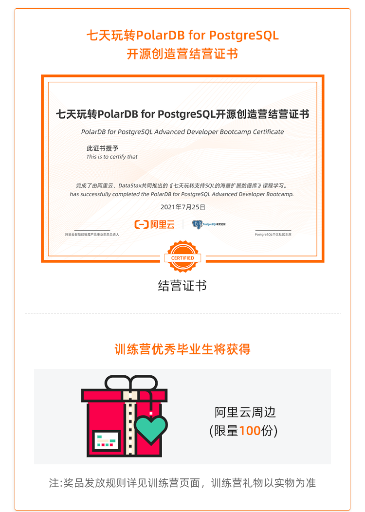 阿里云技术专家在线答疑,同时有小助手监督你学习,完成所有学习打卡任务并通过结营考试,可以获得结营证书、项目offer及PolarDB精美定制礼品。