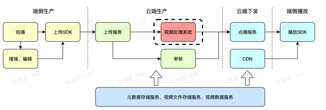 端侧生产:视频的创作者用手机或者其他设备拍摄一个视频,可以对视频做一些增强和编辑,通过上传 SDK,即可把这个视频上传到云端。 云端生产:在云端有两个比较核心的流程:视频处理和审核,这两个流程是并行执行的。 云端下发:当以上两个流程都执行完以后,一个视频也就可以给大家看了,接下来就进入云端下发的阶段。在这个阶段,点播服务负责下发视频的播放地址(包括相关的 meta 信息),然后视频的内容是通过 CDN 下发。 视频播放:这个阶段由播放 SDK 进行端上视频的处理以及渲染。
