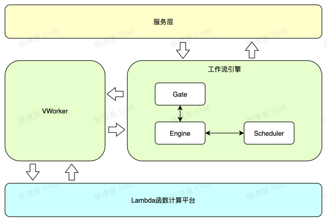 Gate:处理流量调度,包括鉴权的功能。 Engine:管理所有工作流的状态。 Scheduler:一个工作流包含很多节点,Scheduler 可以对每一个节点进行细粒度的任务调度。 VWorker:它是上层和下层的粘合层,会把上层一些偏业务属性的模板转换成一个底层,实际可以执行的函数任务的参数。