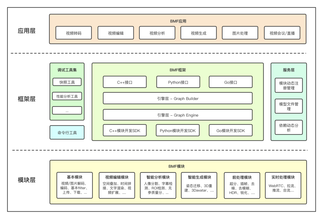 减少视频应用开发的成本,使应用开发标准化。 通过一套框架支持各种复杂的应用场景,从框架本身来讲,它具有比较高的灵活性。 通过这个框架把所有视频处理的原子能力模块化,并且做到动态管理和复用,以此解决大规模协同开发的问题;同时,也能使这些能力比较好地复用在不同的场景和业务上。 屏蔽底层的硬件差异。业务现在会越来越多地用到不同的异构硬件,比如说 GPU,我们希望这个框架能够 原生支持这些硬件。