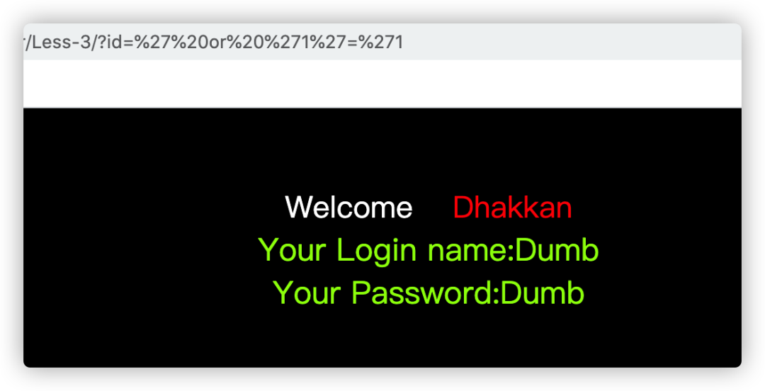 从常理来说,or左边的表达式(''闭合不对称,or右边的表达式中等号右侧的'1')也闭合不对称,那么sql语句拼接后肯定会有语法错误,因此页面返回错误,所以我们可以通过构造payload: 'or '1'='1 观察页面返回情况来判断闭合区间。但往往事实与我们想象的不一样,使用该payload对less-3进行测试,发现登录成功,页面正确返回了Dumb的登录信息,如下图所示(浏览器将’转义为%27,将空格转义为%20)。