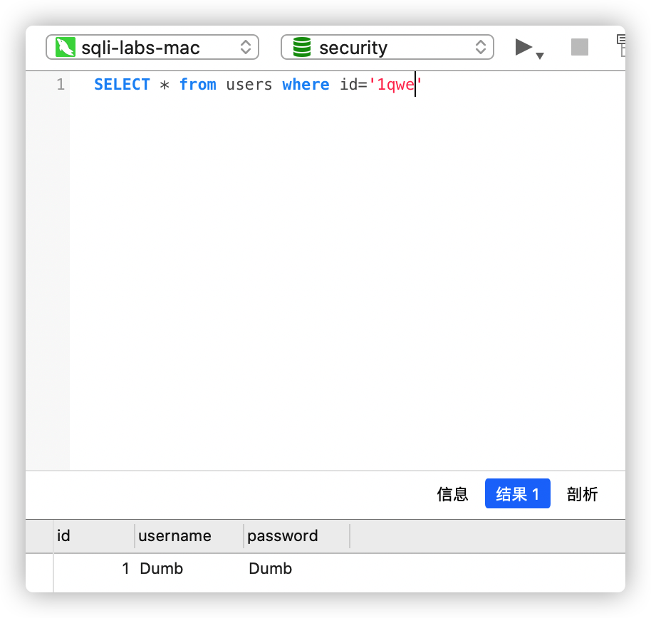 首先让我们看个实例,现在已经知道users表中不存在id为‘1qwe’的用户,因此查询‘1qwe’结果应该为空,但实际上查询了“Dumb”的信息,如下图所示。