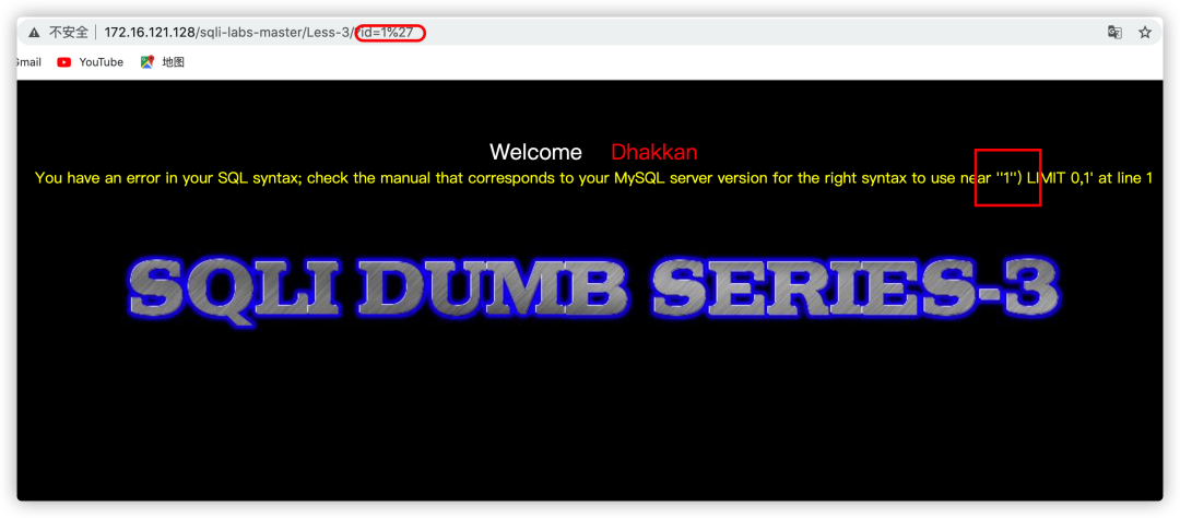 这也就是为什么less-3依旧返回Dumb记录的原因了,因此对于没有报错提示的情况,只能对于每一种闭合区间进行尝试,直到返回预期的结果;而对于有报错信息的情况可以根据报错信息判读闭合区间,如下图所示: