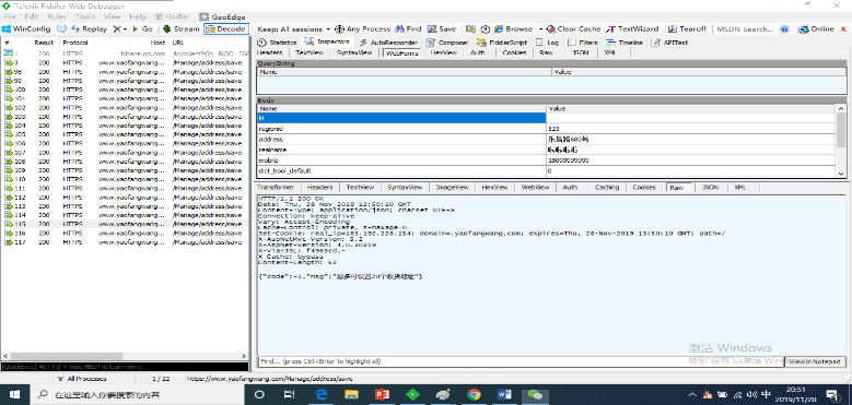 先填好一个收货地址,再打开Fiddler,点击提交,Fiddler抓到保存地址的包