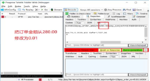 在Fiddler中,把280.00元修改为0.01元。然后点击“Run to Completion”放行。
