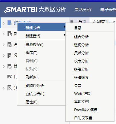 smartbi常用的的功能有组合分析、透视分析、灵活分析、仪表分析、电子表格等。
