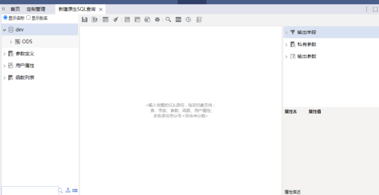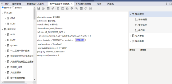 可在查询框内填写包含业务逻辑的查询SQL,SQL查询条件可使用smartbi内创建的参数,SQL填写完成预览无误后,可在输出字段右击检测输出字段,展示该查询的输出字段,便于后续使用该查询的返回结果。