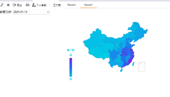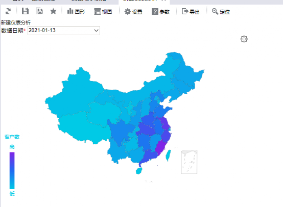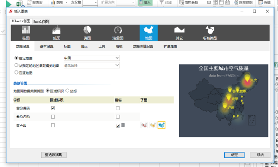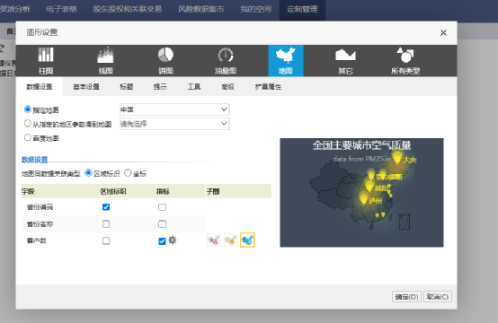 以数据集查询结果制作地图为例,选择地图类型,确认输出字段对应地图字段,其他设置为图形样式、展示效果、工具栏的调整。