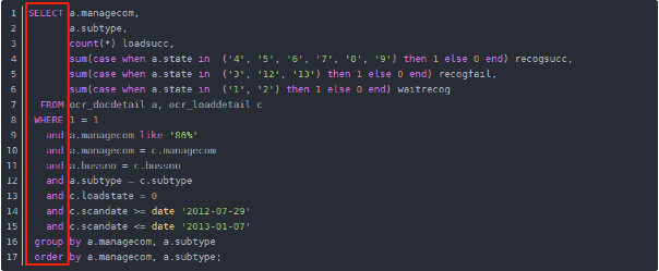 Select/From/Where/Order by/Groupby等子句必须另起一行写。
